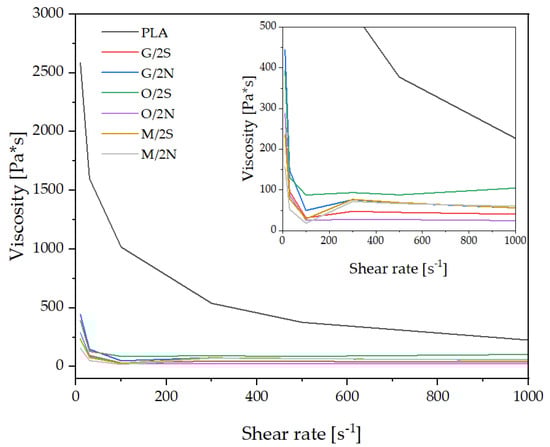 Capillary viscosity tests were conducted for selected composites. The viscosity of the PLA/DE composites modified with silanes was significantly lower than that of the pure PLA (Figure 4) and did not exceed 450 Pa*s independently of the shear rate, with the viscosity decreasing sharply with the increasing shear rate. Once the shear rate reached 100 1/s, viscosity reached a plateau and remained relatively constant for all composites, which was due to the shear thinning effect typical of polymer thermoplastics. The highest viscosity among the composites was recorded for the O/2S system, while the lowest was observed for the O/2N system. It is not clear from the above study which silane additive has the greatest effect on the viscosity of the composites, since the viscosity curves of the produced composites are too similar, but based on this observation it can be stated that the viscosity is both related to the choice of silane and the wax, meaning that there is an interaction between the wax additive and the surface of the silanized filler.