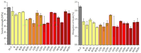 Tensile strength and elongation at break of PLA matrix composites.