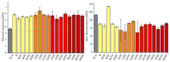 Flexural modulus and maximum flexural stress of PLA matrix composites.