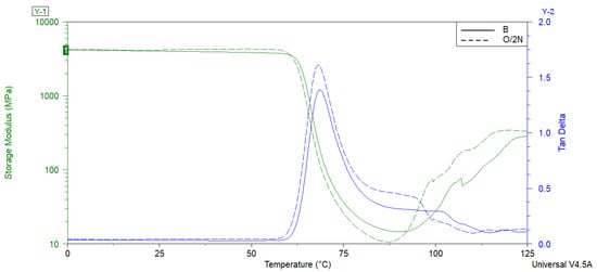 Representative results of the storage modulus and tan δ of the B and O/2N composites.