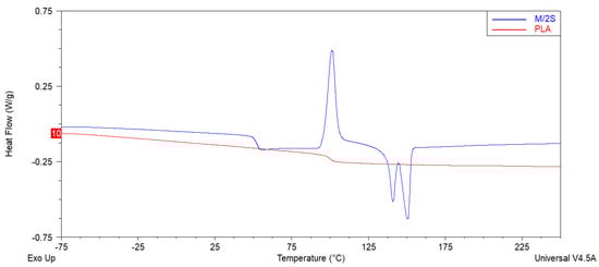 Representative DSC curves of unmodified PLA and M/2S composite obtained during second heating cycle.