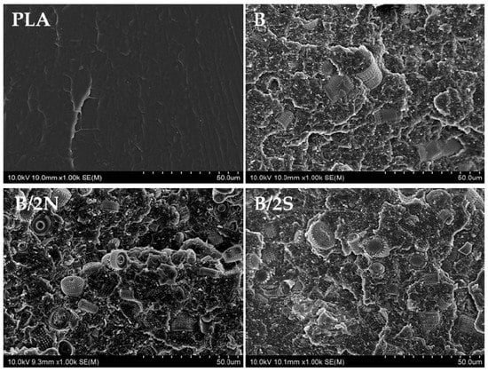 For flexural and tensile strength tests, the materials obtained were cut down into type 1B bar specimens in accordance with EN ISO 527:2012 and EN ISO 178:2006. Tests of the obtained specimens were performed on an INSTRON 5969 universal testing machine with a maximum load force of 50 kN. The traverse speed for tensile strength measurements was set at 2 mm/min, and for flexural strength it was also set at 2 mm/min. A Charpy impact test (with no notch) was performed on an Instron Ceast 9050 impact machine (Instron, Norwood, MA, USA) according to ISO 179−1: 2010 Plastics−Determination of Charpy impact properties—Part 1: Non-instrumented impact test, PKN, 2010. The melt flow rate (MFR) was measured using the Instron CEAST MF20 melt flow indexer (Instron, Norwood, MA, USA), which accords with EN ISO 1133, at 210 °C for a load of 2.16 kg. The thermal properties of the materials (Tg, Tcc, Tm) were studied using a Q1000 differential scanningg calorimeter (TA Instruments, New Castle, DE, USA). Samples with a weight of 8.0 + 0.2 mg were placed into an aluminum hermetic pan. First, the samples were equilibrated at −90 °C, heated to 230 °C with a scan rate of 10 °C/min, and cooled to −90 °C with a scan rate of 10 °C/min. Finally, they were again heated to 270 °C with a scan rate of 10 °C/min. The process was conducted in a nitrogen atmosphere. Using Universal V4.5A TA software, the glass transition temperature (Tg) was determined as the midpoint of the glass transition temperature range. The cold crystallization temperature (Tcc) and melting temperature (Tm) were taken as the peak temperatures of the cold crystallization and melting, respectively. Dynamic mechanical analysis (DMA) was performed using a Q800 DMA (TA Instruments, New Castle, DE, USA) in a dual cantilever mode that accords with ASTM D4065−01. From each composite, three rectangular specimens 60 mm long and 10 mm wide were cut and used in the testing. The analysis was conducted from 0 °C to 130 °C, with a heating rate of 3 °C/min at a frequency of 1 Hz and amplitude of 30 µm. The glass transition temperature (Tg) was determined from the storage modulus curve. The size of the diatoms used to prepare the composites was measured with a Mastersizer 3000 (Malvern Instruments Ltd., Malvern, UK). The measurements were made for the samples in water suspension (Hydro EV attachment). For the wet samples, the stirrer revolution speed was 2330 RPM and the ultrasound power was 70%. The FT-IR measurements were carried out using a Thermo Scientific Nicolet iS50FT-IR spectrometer in transmission mode. Samples weighing 4 mg were mixed with 200 mg KBr and pressed at 10 tons into the form of discs. The spectra were recorded using eight scans of background measurements and sixteen scans of sample measurements in the 400–4000 cm−1 range using a DTGS detector and a KBr beam splitter at 0.5 nm resolution