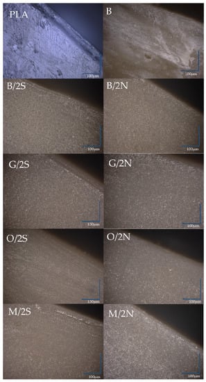 Using an optical microscope, images were taken of the edges of the composites and the reference PLA (Figure 13). The neat PLA showed low scratch resistance, while no scratches or other defects were found on the surface of PLA/DE composites. The edge of the PLA, like the rest of the analyzed samples, was characterized by the presence of a thin layer with a different structure located near the surface. Depending on the filler and type of wax, its depth changed. The addition of the waxes alone resulted in a definite reduction compared with the composite containing only neat diatomaceous earth (B), in which surface discoloration occurred due to poor filler dispersion in the polymer matrix. The modification of the diatomaceous earth with silanes, especially GPTMOS silane, resulted in the formation of a free polymer layer on the sample surface. Considering the thickness of this layer, it can be concluded that natural (beeswax) wax causes this phenomenon to be inhibited, leading to the formation of a composite with a higher degree of dispersion. The composites filled with diatomaceous earth did not show the ability to transmit light, unlike the reference PLA.