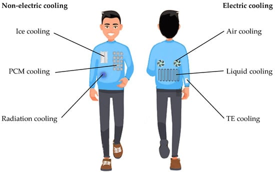A stable core body temperature is essential for maintaining optimal functions of the human body. To reduce the health risks caused by hazardous heat environments, microclimate cooling technologies have been developed to enhance the heat exchange between the human body and the environment. Non-electric cooling strategies, which do not require a power supply system [17,18,19], can be divided into three main types: ice cooling [20], PCMs cooling [21], and radiation cooling [22].