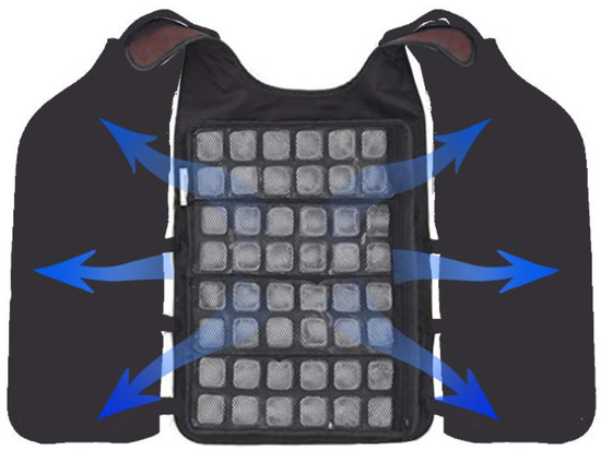 In the early development of PCGs, an ice cooling garments [23] was one of the most common types due to the simplicity of preparation and low cost. It was designed with specific pockets to hold the ice, as shown in Figure 2. Through the ice melting process, the heat generated from the skin surface is absorbed, resulting in a temperature drop and thermal comfort in hot weather. Based on the high latent heat, availability, and low cost, the ice cooling garment was widely applied in protective garment industries [24,25], athletic wear [26,27,28], and military uniforms [29,30]. Juhani et al. confirmed that an ice vest effectively cooled the skin temperature, which was beneficial to both physiology and subjectivity [25]. Furthermore, the thermal comfort provided by the ice cooling vest remarkably increased work efficiency by 10%. The same conclusion was drawn by Cooter et al. [31]. From their study, the effectiveness of the ice vest in improving endurance performance during sustained heavy work was closely examined. However, contact with ice for a long time can lead to tissue irritation [32]. Additionally, the heavy weight, large volume, and cooling interruption have strongly restricted the application of ice cooling garments in daily life. Therefore, the investigation of flexible cooling sources represents a potential approach to solve these problems. Gel ice cooling technology [33,34,35] has been extensively explored lately as a promising candidate. Dehghan et al. compared the effectiveness of an ice gel cooling vest under two exercise intensities and demonstrated a noticeable skin temperature drop, and lower heat strain score index during light activities as a result of the cooling vest [33]. It is noteworthy that under heavy activities, there were no significant differences. Moreover, Chesterton et al. compared the skin-cooling effects of flexible frozen gel and frozen peas [34]. The result indicates that flexible frozen gel is not as effective as frozen peas in skin freezing and calming. Therefore, ice cooling garments with satisfactory cooling performance and flexibility is still a challenge, which requires further studies on advanced materials and technologies.