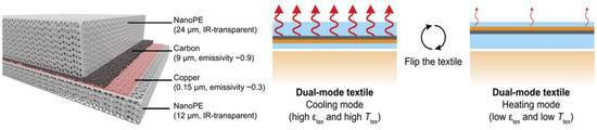 Based on the highly transparent atmospheric window in the infrared (IR) wavelength range between 8 to13 μm, which coincides with the thermal radiation of humans, radiation cooling (RC) can dump human heat directly into outer space without external energy [49]. As a promising alternative technology to locally controlling skin temperature, RC has aroused wide interest in personal cooling garments by taking advantage of an atmospheric window [50,51,52]. Hsu et al. developed an RC textile with good transparency to mid-infrared human body radiation based on nanoporous polyethylene (nanoPE) substrate, which can be used as an infrared radiation heat dissipation fabric for an individual cooling strategy [51]. Due to nanoPE having high transparency and transmittance, it can be appropriately used as a heat dissipation material. Their textile promoted effective radiative cooling and lower temperature around 2.7 °C, which provides a promising textile for personal cooling garments. After development of their textile, they utilized nanoPE embedded with a bilayer emitter to fabricate a dual-mode textile, which has both cooling and heating modes just by flipping the textile, as shown in Figure 3 [53]. The bilayer emitter with the carbon side (high emissivity) and the copper side (low emissivity) noticeably provided a 6.5 °C temperature difference in artificial skin by flipping the same textile, showing a significant technological advancement in wearable RC application.