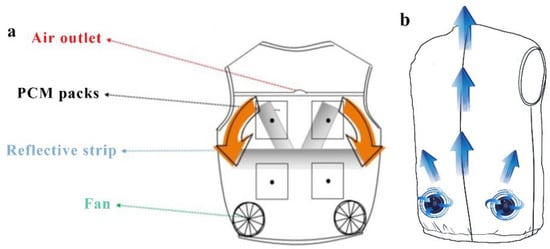 (a) Illustration of air cooling with a PCM cooling vest (PCV), adapted from [72], (b) Schematic diagrams of an air cooling garment.