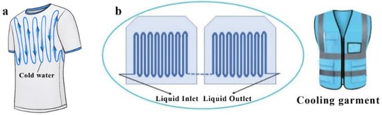 Liquid cooling garments are generally embedded with circulating water tubes filled with a cold liquid resource and a micro water pump device at the inner layer to drive the liquid flowing in the tube to reduce the temperature [65,74], as shown in Figure 5a. The first LCG was supplied to an astronaut as a protective garment to lower the body temperature [75]. After numerous explorations, the LCG has been proven to be one of the most promising technologies in the wearable cooling arena and is used in many fields, such as military [76], mining [77], and sporting [78]. Guo et al. proposed a heat transfer model of LCGs to analyze the effects of different factors on the LCG performance and optimize the design of LCGs [74]. With the optimization they made, the max cooling rate reached 243.2 W/m2 with a maximum work duration time of 3.36 h. However, due to the embedded heavy device and the risk of skin burn caused by the stream formation [79], the LCG needs more efforts to modify the cooling systems for safety and comfort. Grazyna et al. developed a novel LCG with a sensor to adjust the microclimate temperature, and modular knitted fabric, which can be directly worn on the human body [80], resulting in great safety and comfort for the user. The notable tube system they proposed fitted to the skin nicely, which enhanced the thermal conductivity and cooling efficiency. Shu et al. proposed an intelligent temperature control system in LCGs [81], which verified that the new smart system can regulate temperature accurately and extend the duration of more than 30% of the cooling devices.