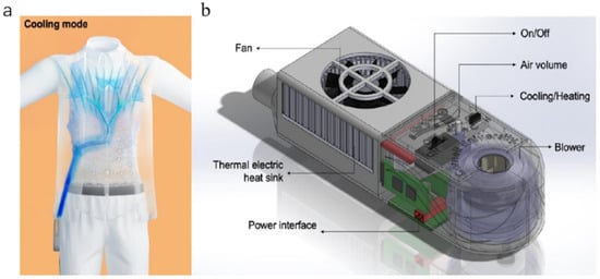 The cooling effect provided by a single air-cooling strategy can be further improved to satisfy the ever-growing cooling needs. Consequently, a lot of efforts have been made in studying the possibility of combining an air-cooling strategy with other cooling methods to explore novel cooling approaches. Ni et al. developed a novel hybrid personal cooling vest (PCV), as shown in Figure 4a [72]. Their novel PCV was incorporated with PCMs and ventilation fans, which indicates the applicability and reliability of this hybrid cooling garment. Through experimental studies, the cooling efficacy in a hot, humid climate chamber was examined. Lou et al. investigated the relationship between the cooling effect with different body positions based on an air tubing network and TE cooling plates, which is helpful to improve the combination of the cooling system and the garment in an effective and comfortable way in daily life [73]. Based on large numbers of studies, the ACG is verifiably suitable to meet the practical wearing demand based on the notable portability and simplicity of operation and usage.