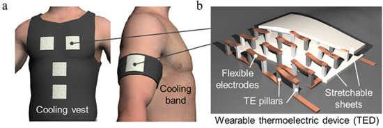 Schematic images of (a) cooling garments with wearable TE devices (TEDs) and (b) the structure of a TED, [98].