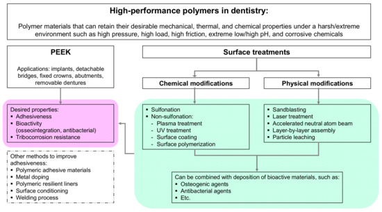 An excellent polymeric material for dental applications is PEEK, a high-temperature semi-crystalline, synthetic thermoplastic polymer [24]. Some literature reviews have been provided on the high-performance PEEK polymer in dentistry, and strategies for its modification already exist [6,25,26,27]. However, a comprehensive review that involves PEEK surface properties, PEEK surface modifications, and the corresponding performance of the PEEK or PEEK-containing composites that are highly related to dental applications is, to the best of the authors’ knowledge, not available. In particular, there is no review that includes the tribological properties of PEEK, as well as the surface modifications by surface polymerization, layer-by-layer assembly, and particle leaching methods. Thus, this review will focus on chemical and physical PEEK surface modifications in dentistry, and how these modifications affect the biological performance of PEEK, such as its adhesiveness (bonding strength), its bioactive properties (osseointegration, antibacterial properties), and its tribological properties, paying particular attention to the effects on the first two properties. The scope of this review is illustrated in Figure 1.