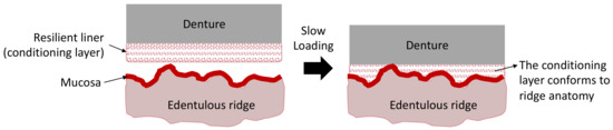 Schematic representation of the loading of the conditioning layer onto the ridge anatomy. The figure is redrawn with modifications from https://pocketdentistry.com/23-denture-liners/, accessed online on 14 November 2022.