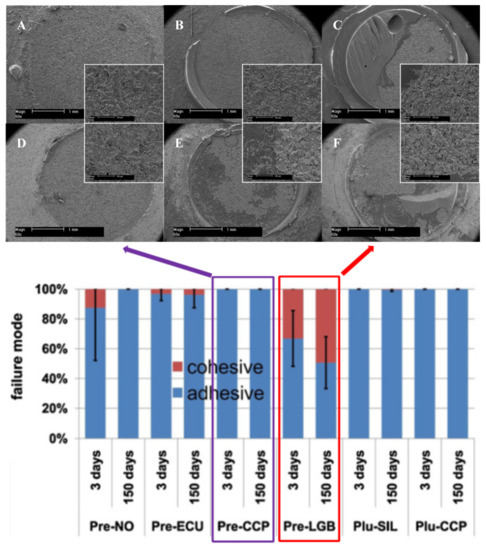 Above: SEM images of group samples measured after three days (A–C) and 150 days (D–F) with 50× and 500× magnifications. (A,D) depict spontaneously debonding, showing complete adhesive failure mode. (B,E) depict samples with medium tensile bond strength (TBS), showing residuals of primer. (C,F) depict samples with high TBS, showing residuals of primer and resin. In (C,F), a multifunctional resin varnish, including methacrylates as a conditioning layer, was applied to air-abraded PEEK surfaces. This conditioning layer demonstrated a long-lasting bond with the PEEK. Below: Failure modes of bonding groups. The figures were adopted and modified from the literature [65].