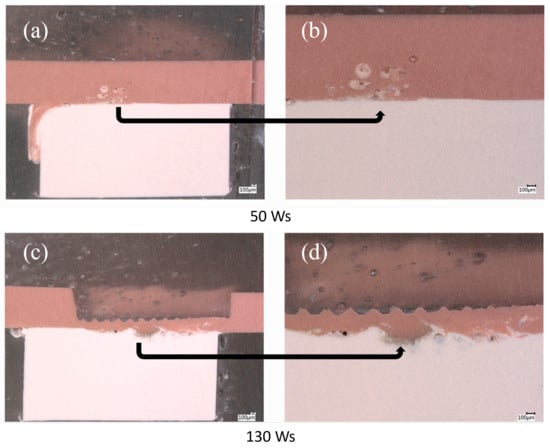 Representative cross sections of the welding joints of the red and white PEEK material combinations at 50 Ws (a,b) and 130 Ws (c,d). Figures (b,d) are the close-ups of (a,c), respectively. The figures were taken and modified from literature [68].