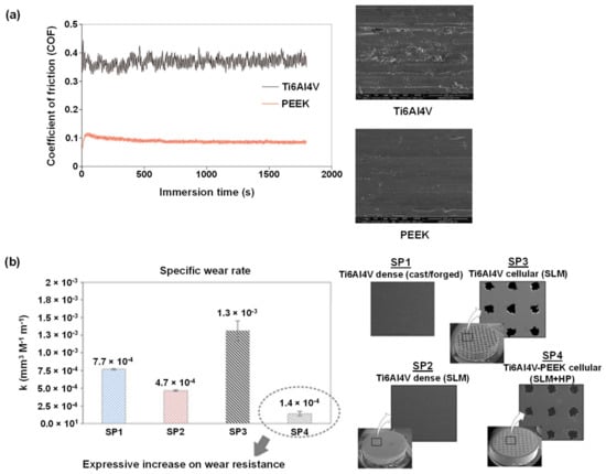 (a) Coefficient of friction as a function of immersion time of Ti6Al4V and PEEK (left) and the corresponding FEG-SEM images of the worn surfaces after reciprocating sliding tests against Al2O3 immersed in artificial saliva at 37 °C (right) [87]. (b) The specific wear rate of various Ti6Al4V-PEEK multi-material specimens against alumina normal load of 6 N at a frequency of 1 Hz and 3 mm of stroke length in Phosphate Buffer Solution at 37 °C (left) and the corresponding SEM images (right). SLM = selective laser melting, HP = hot pressing [96]. The figures were adopted and modified from literature [87,96].