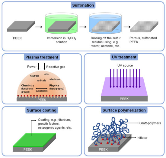 In this section, chemical techniques used for PEEK surface modification are categorized into two groups, i.e., the sulfonation process involving concentrated strong acid and non-sulfonation methods. The scope of the corresponding techniques is illustrated in Figure 6.