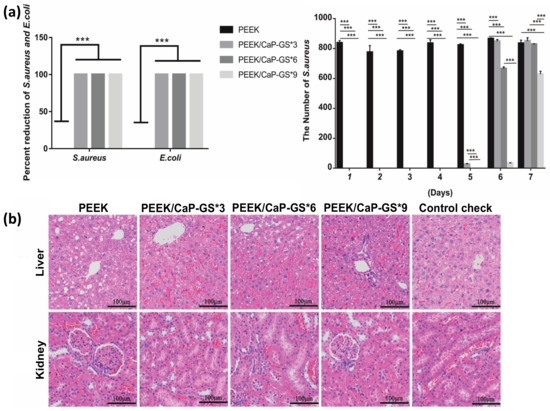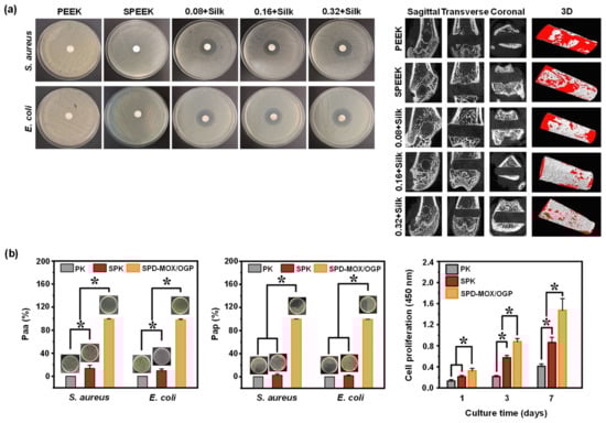 Sulfonated PEEK has also been embedded with strontium carbonate SrCO3 nanoparticles, a bone formation promotor [149]. To allow a steady release of strontium ions, poly(dopamine) was utilized as an intermediate to embed the SrCO3 nanoparticles in the microporous sulfonated PEEK surfaces. The surfaces were then further coated with gentamicin-silk protein, where the release of gentamicin will induce antibacterial properties. Silk proteins were employed as they present abundant functional groups to bind to drug (such as doxorubicin and gentamicin) carriers [150]. In vitro experiments were carried out using bacteria Staphylococcus aureus and Escherichia coli, and cells RAW246.7 and hBMSCs, while in vivo tests were conducted on rats. Both in vitro and in vivo studies demonstrated that the modified PEEK material exhibit robust antibacterial and osteogenic properties (Figure 7a left and right, respectively) [138].