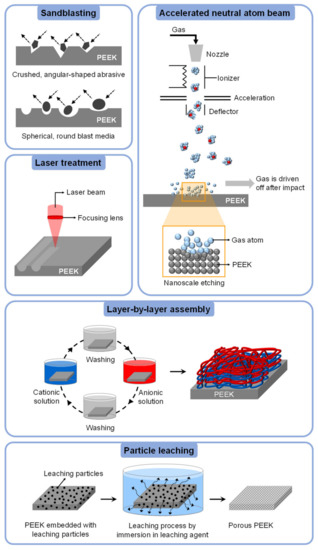 The surface design of dental materials dictates the dental materials' performance in relation to their bonding strength, osseointegration, antibacterial properties, and tribological properties. We note that in this review, we will especially highlight the effects of surface treatments on the first three properties. Further, this review section will focus on two surface modification approaches, i.e., surface topography and surface chemistry, where the combination of these two properties influence surface wettability. Different opinions regarding which surface property is more critical do exist. Cruz et al. stated that surface chemistry plays a more important role than surface topography [38]. On the other hand, Torstrick et al. suggested that surface structure and feature are more important than implant surface chemical composition [74]. Nevertheless, surface modification treatments that alter these surface properties can be classified into two groups, i.e., chemical and physical treatments. Such treated surfaces can then be further modified via biocompatible agents, for example, by depositing bioactive compounds such as growth factors, osteogenic agents, and antibacterial agents [81]. Modifications also involve (nano)composite formation, material blending, and other techniques, however, they are not the focus of this study, as these approaches modify the bulk properties of PEEK. This review aims to discuss surface modification techniques solely.
