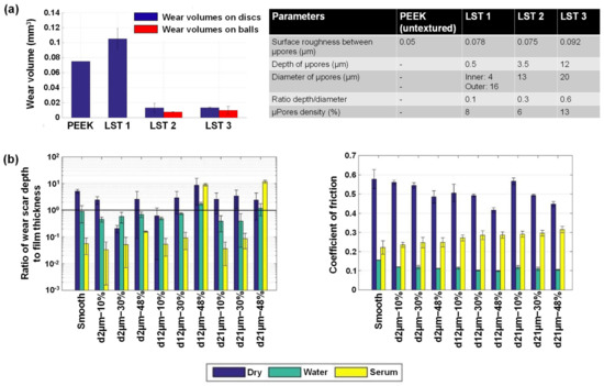- Wang, M. The tribological performance of engineered micro-surface topography by picosecond laser on PEEK. Ind. Lubr. Tribol. 2020, 72, 172–179. [Google Scholar] [CrossRef]