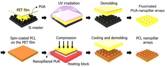 Schematic of the fabrication process for PCL nanopillar arrays using the thermal imprinting technique.