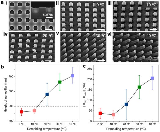 (a) SEM images: (i) negative-type PUA nanopillar mold surface; PCL nanopillars detached from the mold at (ii) 0 °C, (iii) 10 °C, (iv) 20 °C, (v) 30 °C, and (vi) 40 °C; (b) height of the nanopillar with respect to the demolding temperature; and (c) height difference between the mold and fabricated nanopillar with respect to the demolding temperature.