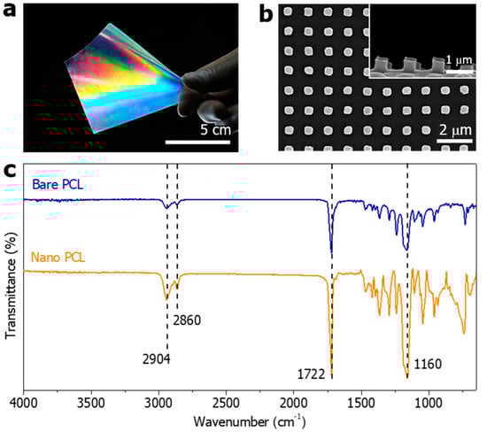 (a) Photograph of the flexible PCL film with nanopillar arrays. (b) SEM images of the PCL nanopillar arrays at 0 °C demolding temperature. (c) FT-IR spectrum of the bare PCL and nanopillared PCL.
