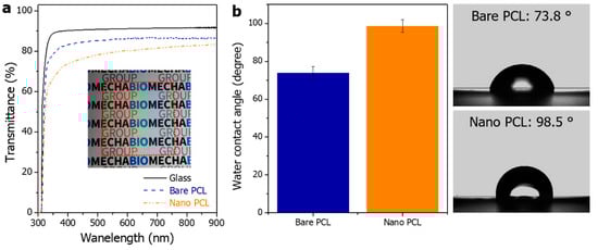 (a) Optical transmittance of the bare and nanopillared PCL film in the wavelength range of 300–900 nm. (b) Water contact angle values of the bare and nanopillared PCL surface (Nano PCL: nanopillared PCL).