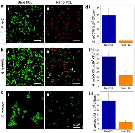 Confocal images of (a) E. coli, (b) B. subtilis and (c) S. aureus cultured on bare and nanopillared PCL samples (green: live cells, red: dead cells). (d) CFU of (i) E. coli, (ii) B. subtilis, and (iii) S. aureus cultured on the bare and nanopillared PCL samples for 18 h.