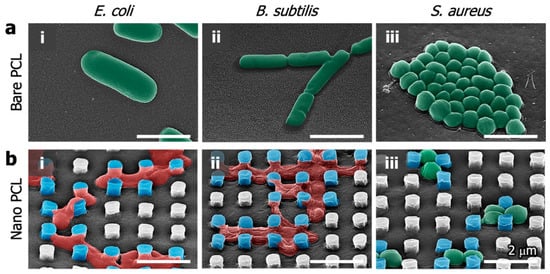 SEM images of (i) E. coli, (ii) B. subtilis and (iii) S. aureus cultured on the (a) bare PCL and (b) nanopillared PCL surfaces for 18 h.