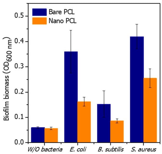 Bacterial biofilm biomass was quantified by CV staining (Figure 7). The OD value of CV in the PCL sample without bacteria was about 0.06 released. After 18 h of culture, the biofilm biomass of E. coli, B. subtilis, and S. aureus was decreased on nanopillared PCL. The biofilm biomass reduction of E. coli, B. subtilis, and S. aureus on the PCL nanopillars was 54%, 43%, and 39%, respectively. On nanopillared PCL, the biofilm formation of E. coli and S. aureus was significantly reduced compared with bare PCL. On the other hand, that of B. subtilis was slightly reduced. B. subtilis showed low biofilm formation on bare PCL, and the formation of biofilm was more repressed by nanopillars. The results of biofilm biomass showed a similar trend to the antibacterial results of the nanopillars (Figure 5 and Figure 7). Nanopillars can kill by damaging the membranes of the attached bacteria. In addition, bacterial growth was limited by reducing the growth area of the attached bacteria. As a result, nanopillars can inhibit the formation of biofilms on the surface.