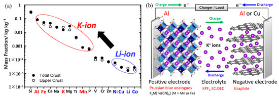(a) Elemental abundance in the Earth’s crust. (b) Schematic illustration of the cell configuration and operational mechanism of a typical K-ion battery. (a,b) Reproduced with permission from Ref. [7]. Copyright 2020 American Chemical Society.