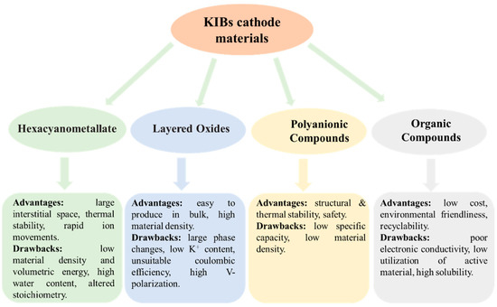 Inorganic substances (such as layered metal oxides, metal sulfide phosphide, polyanionic compounds, carbon-based materials, and alloy-based materials) and organic substances are now used as electrode materials for KIBs [20,28,29,30,31,32,33,34,35]. Due to a number of benefits, organic polymer materials are more desirable than inorganic ones. First off, because organic polymer materials contain naturally plentiful C, H, N, O, and S, they are more environmentally benign, while transition metals are present in inorganic compounds. Second, materials made of organic polymers have adaptable molecular architectures that might make them better hosts for K-ions. Lastly, the fact that the feedstock is renewable makes polymers less expensive [36,37,38,39]. Polymers as electrode materials can be divided into cathode and anode materials for KIBs. Among them, research on polymer cathode materials is more extensive than on anode materials, with carbonyl (C=O groups) containing polymers making up the majority of the polymer cathode materials.