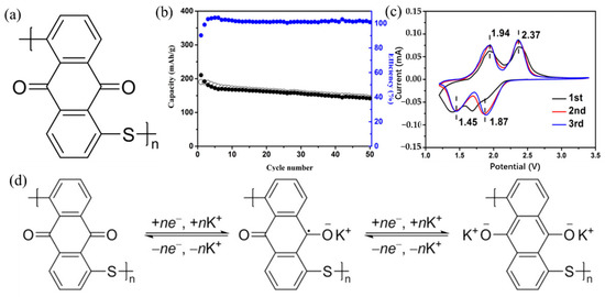 If crystalline materials are utilized as cathodes, the bulky size of K+ would result in significant strain, which could be the biggest difficulty for KIBs. Currently, the majority of studies on cathode materials for KIBs are restricted to hexacyanometallates, layered oxides, polyanionic compounds, and organic compounds [40,41,42,43,44,45,46,47,48]. Figure 2 summarizes the advantages and disadvantages of these cathode materials for KIBs. More advanced cathode materials must be created, as the quest for cathode materials appropriate for KIBs has barely begun. Limited doping and increased dead mass are the two vital issues with using polymer as a KIBs electrode [23]. Therefore, there is a pressing need for research into developing novel polymers to address these issues. Carbonyl-containing polymers are in a class of cathode materials used in KIBs. Since poly (anthraquinone sulfide) (PAQS) has been employed in numerous studies as the cathode of LIBs, sodium-ion batteries, and magnesium-ion batteries and has demonstrated high capacity (~200 mAh/g) and good cycle stability [49,50,51], it is meaningful to examine the storage behavior of K+ in PAQS. Ji et al. [52] used a very simple method to synthesize PAQS (see Figure 3a for the unit molecular structure of PAQS) and investigate its electrochemical K+ storage performance for KIBs for the first time. The PAQS electrode exhibited a high reversible capacity of 190 mAh/g at the current density of 20 mA/g (Figure 3b), 84% of its theoretical capacity (for two K+ insertion/extraction). The PAQS electrode also displayed a good cycling performance, its capacity retention can reach 75% after 50 cycles, outperforming the organic molecular solid-PTCDA [53]. According to the CV results shown in Figure 3c, the K+ storage mechanism in PAQS was two K+ inserted into two sequential steps, which was similar to PAQS/Na cells [51]. A potential redox mechanism for potassium storage in PAQS is shown in Figure 3d. Another cathode polymer that has been mentioned in the previous report is poly (pentacenetetrone sulfide) (PPTS). Due to its large π-conjugated system, PPTS may achieve layer-by-layer stacking, effectively increasing the charge transport and ion diffusion of Na+ [54]. Based on this, Wang’s group [55] reported the PPTS as a cathode for KIBs with a superior rate capability and an ultralong cycling life. The PPTS delivered a reversible capacity of 260 mAh/g at a current density of 0.1 A/g over 100 cycles. It was impressive that the PPTS still exhibited a high reversible capacity of 190 mAh/g after 3000 cycles even at a high current density of 5 A/g, which was the best KIBs performances among all the reported polymer cathodes. The combination of a capacitive process, fast K+ diffusion, and low internal resistance may be responsible for this exceptional performance.