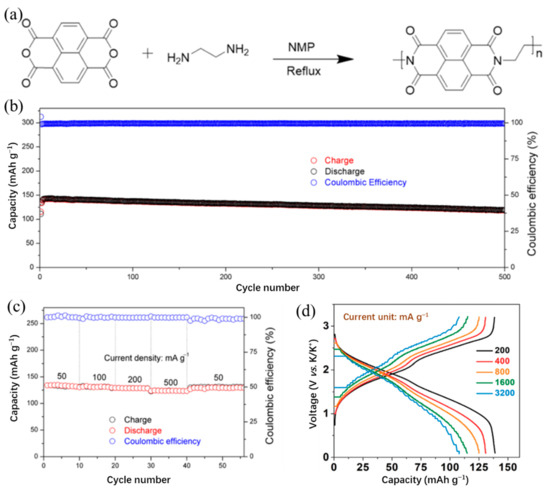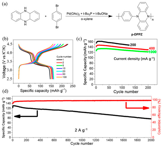 Some nitrogen-containing polymers have also been identified as potential cathode materials for KIBs, including poly (N, N′-diphenyl-p-phenylenediamine (PDPPD), poly (N-phenyl-5,10-dihydrophenazine) (p-DPPZ), and hexaazatriphenylene-based polymer (PHAT) [60,61,62]. Troshin et al. [60] synthesized and investigated redox-active PDPPD material for KIBs, which delivered a maximum capacity of 63 mAh/g and an 86% capacity retention after 500 cycles at 1C. However, ultrafast charge–discharge cycling of the PDPPD-based KIBs was unsatisfactory; this may be a significant restriction correlation between the battery operation at high current rates and the alkali-ion diffusion kinetics. In a later work, Troshin et al. [61] explored high-voltage p-DPPZ cathodes for KIBs for the first time. The p-DPPZ was prepared based on the reduction of phenazine to 5,10-dihydrophenazine and the following Buchwald–Hartwig condensation (Figure 5a). The p-DPPZ cathodes exhibited the highest capacity of 162 mAh/g at the current density of 200 mA/g (Figure 5b,c). At high current density of 2 A/g, the batteries exhibited maximum specific capacity of 131 mAh/g with a retention of 79 and 59% of this value after 1000 and 2000 cycles, respectively (Figure 5d). Additionally, Kapaev et al. [62] synthesized PHAT cathodes and showed comparable and very promising performances in Li-, Na-, and K-ion cells. The best reported performance was shown by the developed polymer PHAT in KIBs, which had high specific capacities, high energy densities, and great rate capabilities. Most remarkably, no capacity fading was observed after 4600 cycles at the high current density of 10 A/g. Their report further advanced the development of polymer cathodes for KIBs. We list the polymer cathodes for KIBs in Table 1.