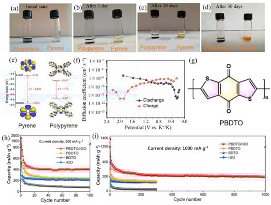 (a–d) Digital photos of the pyrene and polypyrene dispersed in the electrolyte of KIBs for different time intervals. (e) Theoretical calculated HOMO and LUMO in optimized structures of pyrene and polypyrene. (f) Diffusion coefficients at different potentials during potassiation and depotassiation of polypyrene. (a–f) Reproduced with permission from Ref. [63]. Copyright 2021 Elsevier B.V. (g) The molecular structure of PBDTO. Cycling performance (h) at 100 mA/g and (i) at 1000 mA/g of PBDTO/rGO, PBDTO, BDTO, and rGO. (g–i) Reproduced with permission from Ref. [64]. Copyright 2022 Elsevier B.V.