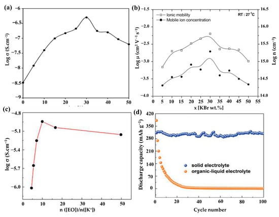 The proper addition of potassium salt components to single PEO-based Pes is an efficient way to increase the polymer’s amorphous percentage. The benefits of K+ ion salt are its abundance, low cost, and less susceptibility to moisture [84]. By dissolving the suitable salt, the polymer’s structure and characteristics can also be altered [85]. In 2015, Chandra [86] reported the synthesis, ion conduction, and polymeric battery fabrication of K+-conductive solid Pes (SPEs): (1-x) PEO:x KBr (where 0 < x < 50 in wt%) film by the solvent-free/hot-press method. The conductivity of various SPEs films at room temperature is discovered to be dependent on the salt concentration, as illustrated in Figure 7a. The ionic conductivity (σ) of SPE film that increased with the addition or complexation of KBr salt, and the maximum conductivity of ~ 5.01 × 10−7 S/cm, was observed in SPE film with the KBr concentration of 30 wt% (70PEO:30KBr), which displayed an enhancement of two orders of magnitude compared to that of pure PEO. The reason for the increase in σ is due to the rises in ionic mobility (μ) and mobile ion concentration (n), as shown in Figure 7b. The increases in μ and n are mainly due to the crystallinity of the polymer decreasing or the availability of more conducting paths and the increasingly larger number of mobile ions, respectively. As the concentration rises, the conductivity tends to decline, possibly as a result of ion binding [87]. Additionally, when the mass ratio of the KBr concentration is higher than 50, the SPE films become fragile and less flexible. Moreover, Chandra et al. [88] reported K+ ion-conducting SPEs: (1-x) PEO: xKCl, where 0< x < 50 in wt%, and investigated the electrical properties of these newly synthesized SPEs. Similarly, in Kesharwani et al.’s work [89], they examined how different CH3COOK concentrations affected the conductivity of SPE films as well as the ion transport behavior in K+-ion conducting SPE films ((1-x) PEO: x potassium acetate (CH3COOK)). The SPE films: ((1-x) PEO: xCH3COOK) were prepared via hot-press technique and exhibited a relatively higher room temperature conductivity of ~2.74 × 10−7 S/cm when the PEO/CH3COOK weight ratio was 95:5.