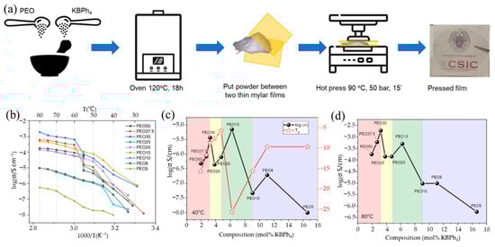 (a) Schematic sequence of the synthesis route of PEO/KBPh4 electrolyte films by hot pressing. (b) Arrhenius plots for all of the polymer/salt composite electrolytes. (c,d) Isotherms of ionic conductivity vs. mole fraction of KBPh4 in the polymer electrolyte at (c) below (40 °C) and (d) above (80 °C) the melting point of crystalline PEO. Tg values are plotted in the secondary y-axis of (c). (a–d) Reproduced with permission from Ref. [91]. Copyright 2022 American Chemical Society.
