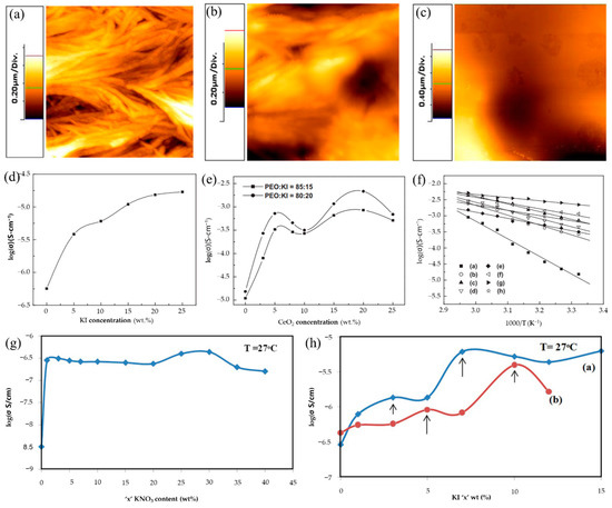 Two-dimensional AFM topographic images of (a) pure PEO; (b) PEO-KI (wt.% ratio 80:20) and (c) 20 wt.% CeO2 of PEO-KI-CeO2 composite polymer electrolytes. (d) Variation of conductivity with KI salt concentrations in polymer electrolyte complex at room temperature. (e) Variation of conductivity with CeO2 concentrations in the composite polymer electrolyte complex at room temperature. (f) Temperature dependence conductivity plots of PEO-KI-CeO2 composite polymer electrolytes with different CeO2 concentrations ((a–h): 0 wt.%−25 wt%). (a–f) Reproduced with permission from Ref. [96]. Copyright 2011 Elsevier Ltd. (g) Salt concentration-dependent conductivity variation for hot-press-cast SPE films: [(1-x) PEO: xKNO3]. (h) Filler (KI) concentration-dependent conductivity variation for CPE films: [(95PEO: 5KNO3) + KI] (♦); [(70PEO: 30KNO3) + KI] (•). (g,h) Reproduced with permission from Ref. [104]. Copyright 2017 Elsevier B.V.