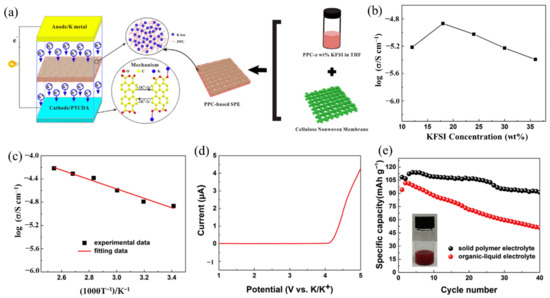 The PEs matrix category also includes polycarbonate. Due to its environmental friendliness, the new polycarbonate Poly (propylene carbonate) (PPC) has garnered considerable interest [115,116]. Inspired by the work of Cui’s group [115] on SPE, they used PPC as the ionic transit material and developed a cellulose nonwoven membrane as the backbone for LIBs. Feng et al. [117] designed a PPC-KFSI with cellulose nonwoven backbone SPE (PPCB-SPE) for high-safety solid-state KIBs, as shown in Figure 10a. The PPCB-SPE presented the maximum ionic conductivity of 1.36 × 10−5 S/cm at a KFSI salt concentration of 18 wt% at 20 °C (Figure 10b). Additionally, PPCB-SPE has an ionic conductivity of up to 6.06 × 10−5 S/cm at 120 °C, which could be attributed to the decreased Tg value (Figure 10c). Figure 10d shows that the PPCB-SPE had an excellent electrochemical stable window of 4.15 V, which was enough to meet the demands of the perylene-3,4,9,10-tetracarboxylic dianhydride (PTCDA) cathode electrode for KIBs. The assembled full cell (K||PPCB-KFSI SPE||PTCDA) exhibited an excellent cycle performance (Figure 10e). The discharge capacity of the PTCDA cathode with PPCB-KFSI SPE reached 113 mAh g−1 at 20 mA g−1 after an activation process, and the capacity retention rate can reach 84.3% after 40 cycles, while the capacity with conventional organic–liquid electrolyte (OLE) suffered a great fading of 45.7%. The rapid fading of the capacity with OLE may be on account of the high solubility of PTCDA into the OLE (the inserted digital image of Figure 10e), while the SPE could effectively inhibit the dissolution of PTCDA and other irreversible side reactions [118].