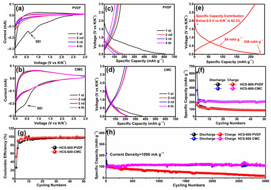 CV curves of HCS-600 using (a) PVDF and (b) CMC binders. Galvanostatic charge–discharge profiles of HCS-600 using (c) PVDF and (d) CMC binders. (e) Second discharge specific capacity contribution of HCS-600 using the CMC binder below 0.5 V vs. K/K+. (f) Cycling performance and (g) Coulombic efficiency of HCS-600 using PVDF and CMC binders tested at 50 mA/g. (h) Long-term cycling performance tested at 1000 mA/g. (a–h) Reproduced with permission from Ref. [155]. Copyright 2019 American Chemical Society.