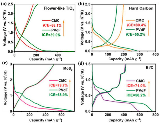 Advantages of CMC over PVdF as the binder in different electrode materials. (a) Flower-like TiO2, (b) hard carbon, (c) MoS2, and (d) Bi/C as the anode materials for K storage at 0.1 A/g. (a–d) Reproduced with permission from Ref. [158]. Copyright 2022 The Royal Society of Chemistry.