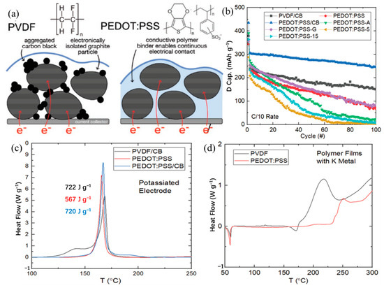 - Gribble, D.A.; Li, Z.; Ozdogru, B.; McCulfor, E.; Çapraz, Ö.Ö.; Pol, V.G. Mechanistic Elucidation of Electronically Conductive PEDOT:PSS Tailored Binder for a Potassium-Ion Battery Graphite Anode: Electrochemical, Mechanical, and Thermal Safety Aspects. Adv. Energy Mater. 2022, 12, 2103439. [Google Scholar] [CrossRef]