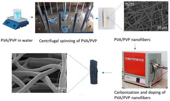 In order to produce boron, nitrogen, and fluorine (B, N, F)-doped PVA/PVP-based carbon nanofibers, 0.5 mL 1-butyl-3-methylimidazolium tetrafluoroborate was dissolved in 5 mL of distilled water; then, the PVA/PVP-based carbon nanofibers were immersed in this solution. After drying, PVA/PVP-based carbon nanofibers were put in a furnace and heated to 700 °C with a heating rate of 10 °C under a nitrogen atmosphere and held at 700 °C for 10 h. A schematic illustration of the preparation of centrifugally spun B, N, F-doped CNFs is shown in Figure 1.