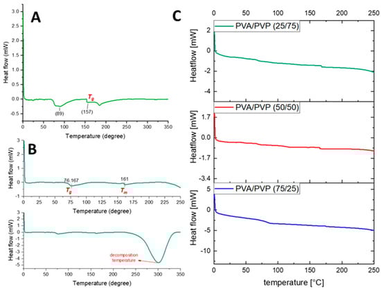 DSC thermograms of (A) PVP, (B) PVA, and (C) PVA/PVP blend nanofibers.