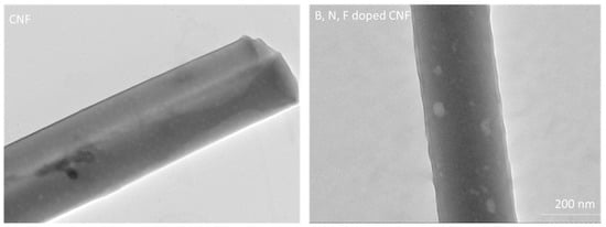 Figure 6 presents SEM images of B, N, F-doped CNFs. As shown in the SEM images, B, N, F-doped CNFs also have a fibrous morphology, which is useful for electron transport [61,62]. TEM images of CNFs and B, N, F-doped CNFs are presented in Figure 7. As shown in these images, both of them have a long fibrous morphology. The TEM images of B, N, F-doped CNFs display their porous structure, with the surface of the carbon nanofibers becoming rougher, with a high number of defects. The presence of more defects on the surface of fibers obtained through B, N, F doping was also reported by Wang et al. [62].