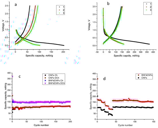 Figure 9a,b show the discharge/charge voltage profiles of the initial three cycles for CNFs and B, N, F-doped CNFs, respectively. In the first cycle, the discharge and charge capacities were 203 mAh/g and 83 mAh/g, respectively, for CNFs, which led to a low Coulombic efficiency, around 30%, resulting from SEI formation [15]. During the first cycle, the discharge and charge capacities of B, N, F-doped CNFs were 370 and 153 mAhg−1, respectively, giving an initial Coulombic efficiency of around 41%. The inevitable formation of an SEI layer was responsible for the 59% capacity loss in the first cycle [73,74]. During the second cycle, the discharge was reduced to 166 mAhg−1, with a charge capacity of 150 mAhg−1, resulting in a rapid increase in the Coulombic efficiency to 90%, further indicating the good reversibility of the B, F, N-doped CNF electrodes. After 10 cycles, the Coulombic efficiency increased to 99%. Figure 9c displays the cycling performance of CNFs and B, N, F-doped CNFs at a current density of 100 mAg−1. It can be seen that the B, N, F-doped CNFs exhibited a high reversible capacity of around 150 mAhg−1 in 200 cycles. However, the reversible capacity of CNFs was around 100 mAhg−1 in the first 200 cycles. A significant increase in reversible capacity with B, N, F doping was also reported for cathodes in lithium ion batteries [75]. The improvement was ascribed to an enhanced amount of charge carriers, a high number of defects, and a synergetic effect. B, N, F doping also increased the number of active sites and enhanced the electronegativity of electrodes in Zn-air batteries [76].