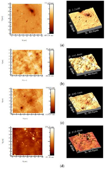 Two-dimensional and three-dimensional topographic images for PHBV/BC biocomposite films recorded by atomic force microscopy (AFM) are depicted in Figure 1, whereas root mean square roughness (RMS), defined as the standard deviation of height above an average plane, is shown in Table 2.
