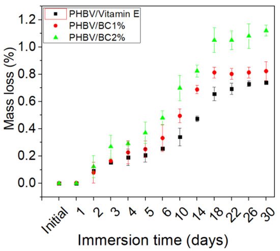 Mass loss of PHBV/BC biocomposites immersed in PBS as a function of exposure time (after 30 days in vitro hydrolytic degradation).