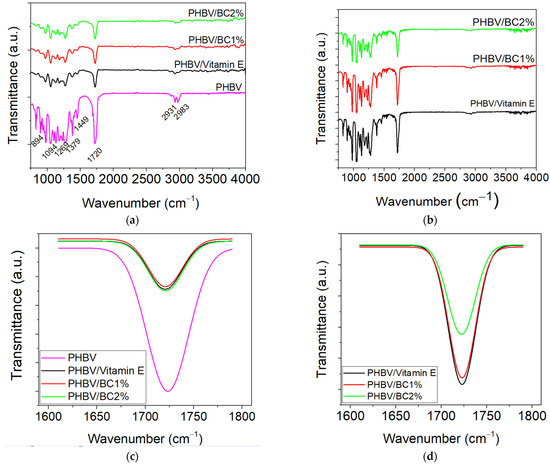 ATR-FTIR normalized spectra for biocomposites based on PHBV, BC and vitamin E. (a) initial; (b) after 30 days immersion in PBS; (c) carbonyl stretching region (–C=O) for initial samples; (d) carbonyl stretching region (–C=O) for degraded samples in PBS.