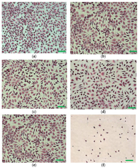 Cell morphology after 48 h treatment with different biocomposites: neat PHBV (a); PHBV/Vitamin E (b); PHBV/BC1% (c); PHBV/BC2% (d). Negative control was represented by untreated cells (e) and positive control by cells cultivated in MEM containing 0.003% H2O2 (f). Scale bar = 50 μm (hematoxylin-eosin staining).